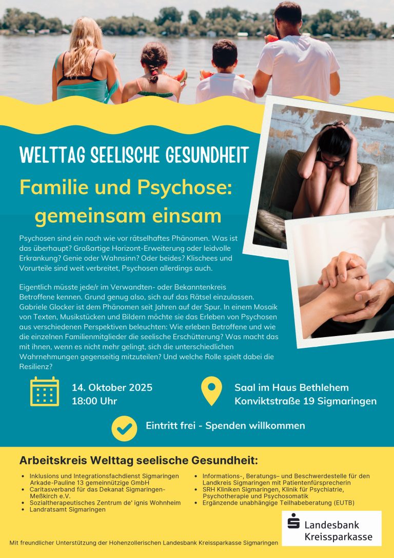 Der Vortrag von Gabriele Glocker mit dem Titel „Familie und Psychose: Gemeinsam einsam“ findet am Dienstag, 14. Oktober 2025, um 18:00 Uhr im Saal des Hauses Bethlehem (Konviktstraße 19, 72488 Sigmaringen) statt. Der Eintritt ist frei, Spenden für die Arbeit des Arbeitskreises Welttag seelische Gesundheit sind willkommen.